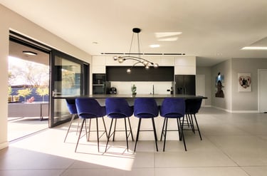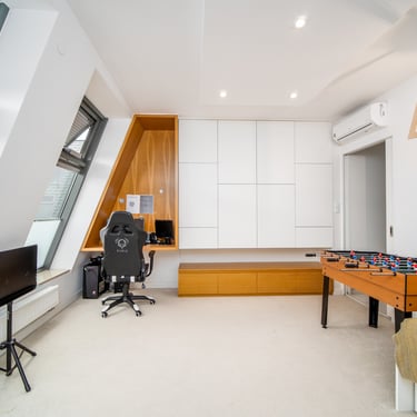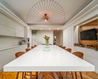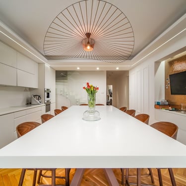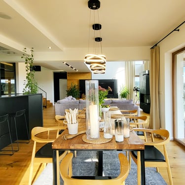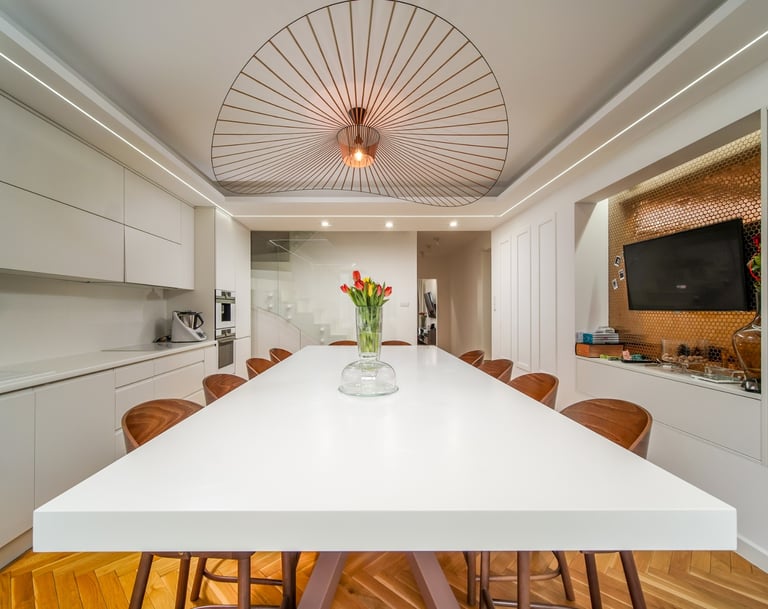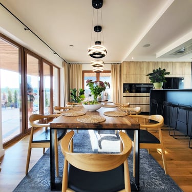 Dominują tu czyste linie, minimalistyczna zabudowa oraz starannie ukryte detale techniczne. Centralnym punktem wnętrza jest duży stół jadalniany, przy którym spotyka się rodzina i goście. Jego geometryczna forma i połączenie z eleganckimi krzesłami tworzą wyrafinowaną, a jednocześnie przytulną atmosferę.