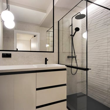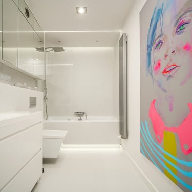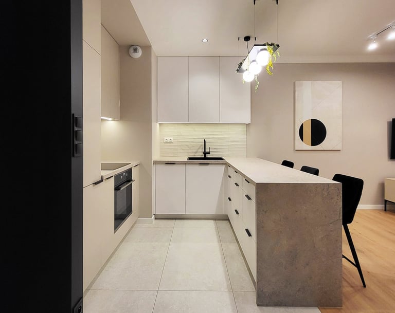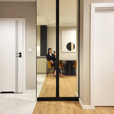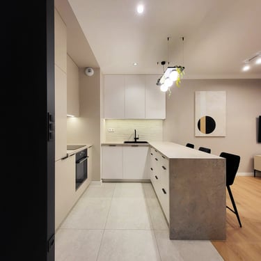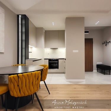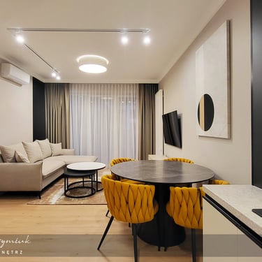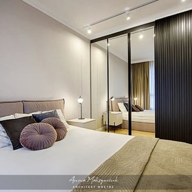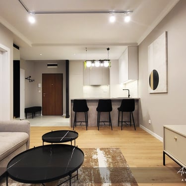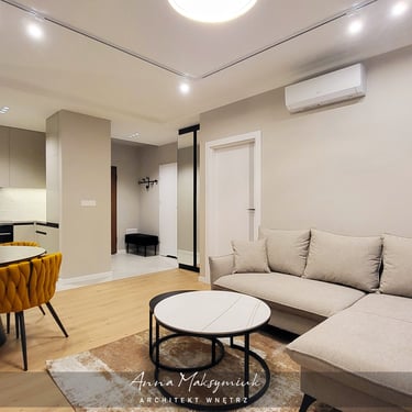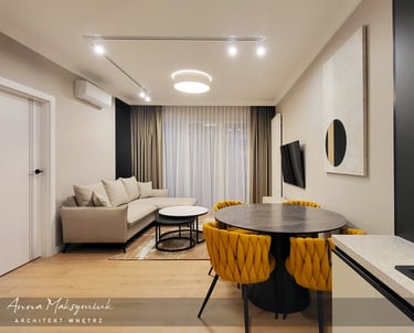 Prace projektowe i wykonawstwo dwóch projektów w tym samym czasie. Dwa apartamenty o tej samej powierzchni i układzie. Oba mieszkania mają niemal identyczny układ funkcjonalny, ale w jednym pojawiła się – klasyczna zabudowa i stół jadalniany, w łazience wanna, a w drugim - kuchnia z wyspą, a w łazience prysznic.