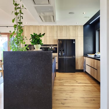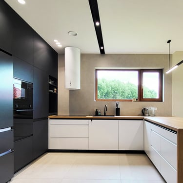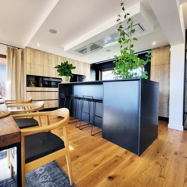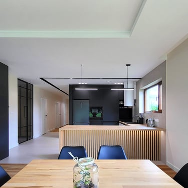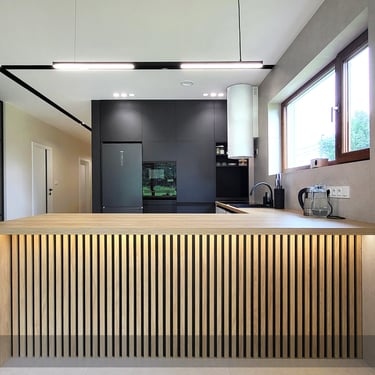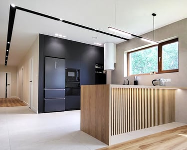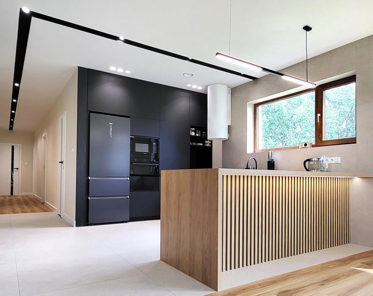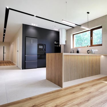 Dominują proste linie, nowoczesne oświetlenie liniowe i naturalne materiały. Ciemna zabudowa kuchenna kontrastuje z jasnymi ścianami i ciepłym drewnem wyspy, a pionowe lamele subtelnie podkreślają rytm i porządek wnętrza.