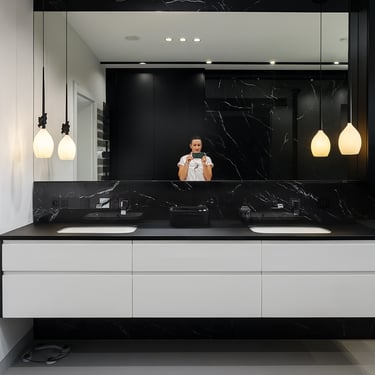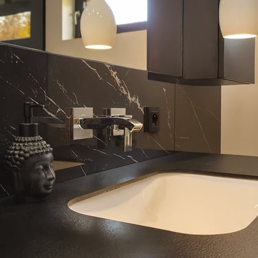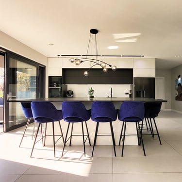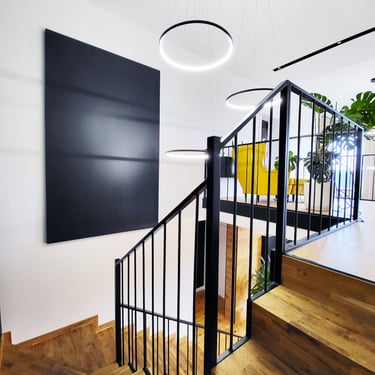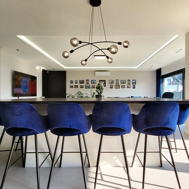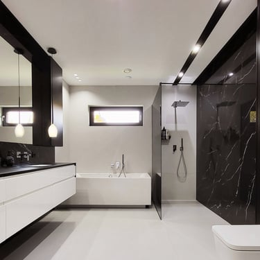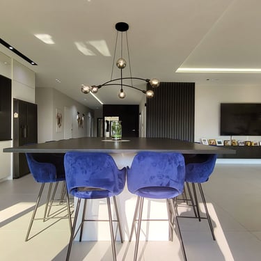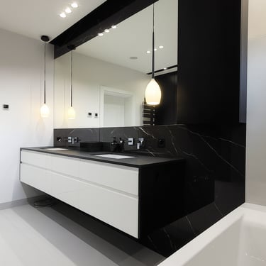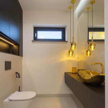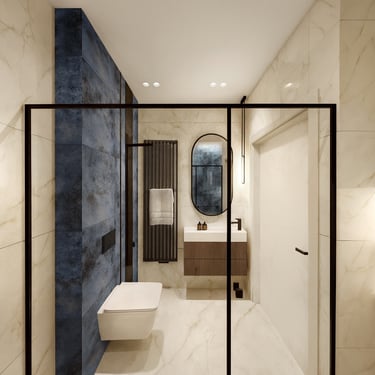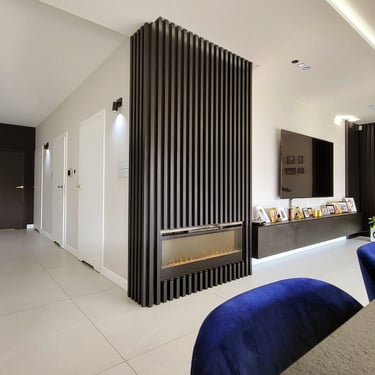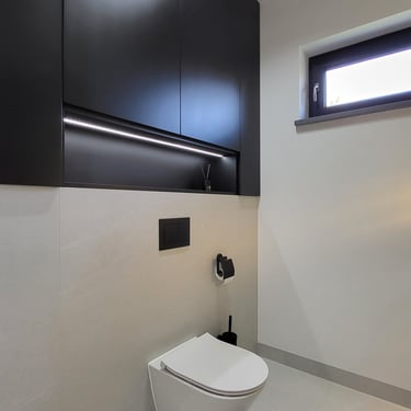Ta realizacja różni się od poprzednich i taka była wizja Inwestorów - nowocześnie, kontrastowo i z przewodnim kolorem granatu. Otóż nie każdy w swojej przestrzeni otacza się drewnem lub jego imitacją. Projekt od początku był odgórnie ukierunkowany na nowoczesny styl, który bardzo łączy się z zamiłowaniem właścicieli do najnowszych trendów praktycznie w każdej dziedzinie: motoryzacji, mody czy też nowinkach technologicznych. Wnętrza oczywiście również musiały być spójne z osobistymi preferencjami użytkowników oraz spełnić funkcjonalność. Kolorystyka i materiały, miały być najmniej obsługowe, stwarzać komfort czystości.