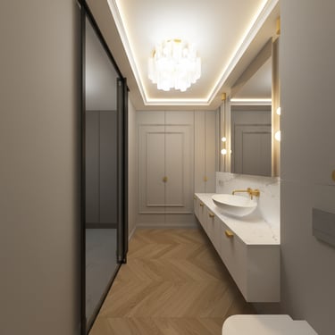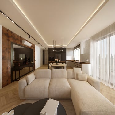 Całość dopełniają detale: miedziane wykończenia, eleganckie linie mebli i naturalny układ parkietu w jodełkę. Projekt stanowi idealne połączenie nowoczesnej estetyki z ciepłem domowego wnętrza – przestrzeń stworzona z myślą o komforcie i harmonii.