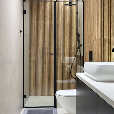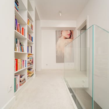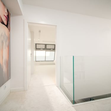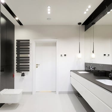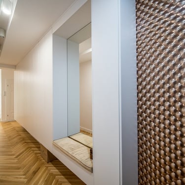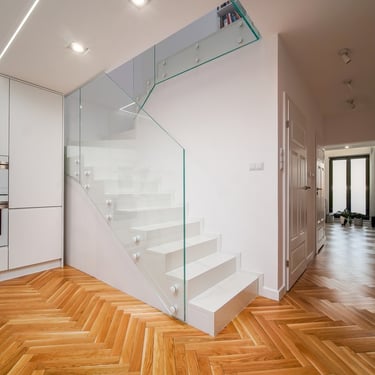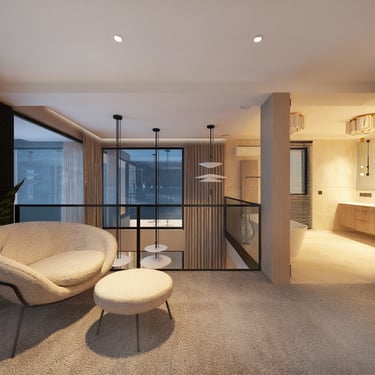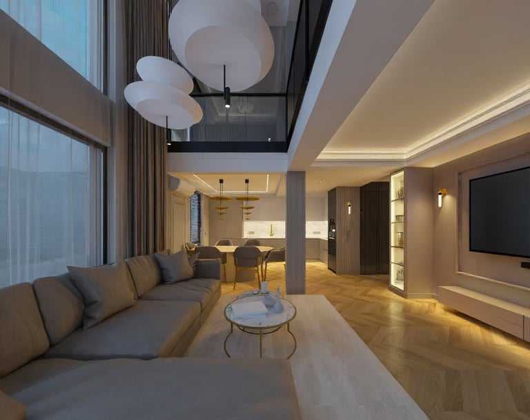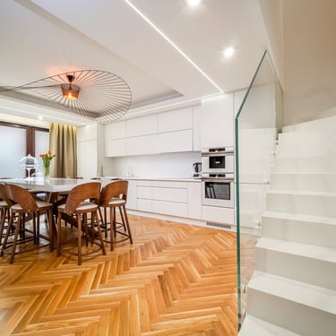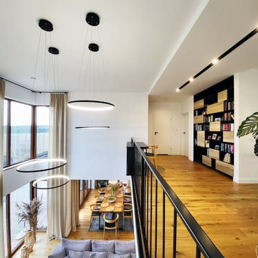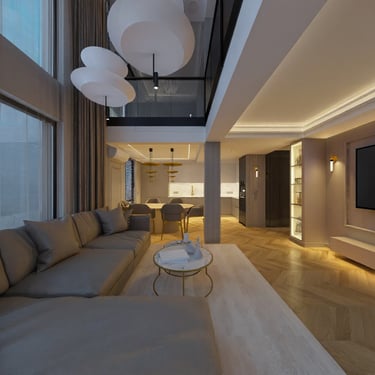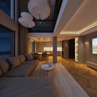 Dwupoziomowy apartament to przestrzeń, w której prostota formy spotyka się z funkcjonalnym komfortem. Projekt opiera się na harmonii bieli, ciepłych tonów drewna oraz subtelnych akcentach w postaci miedzi i szkła.