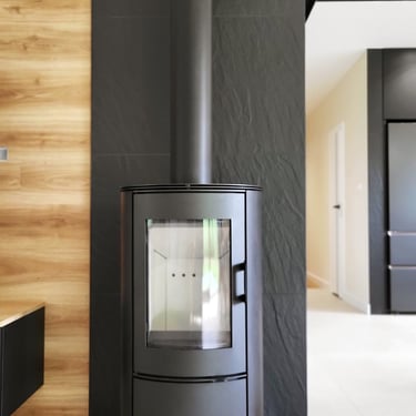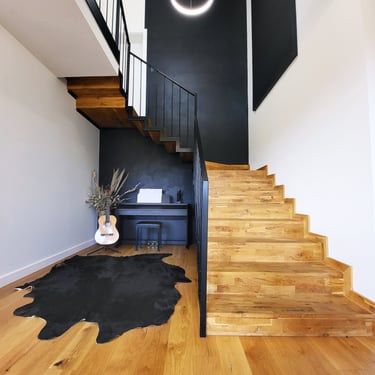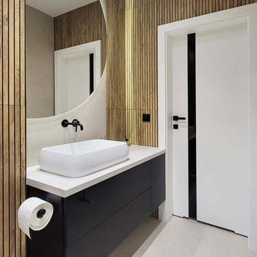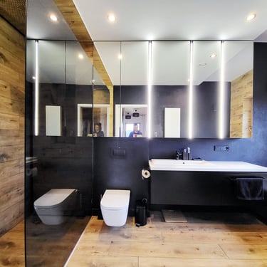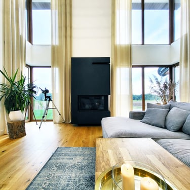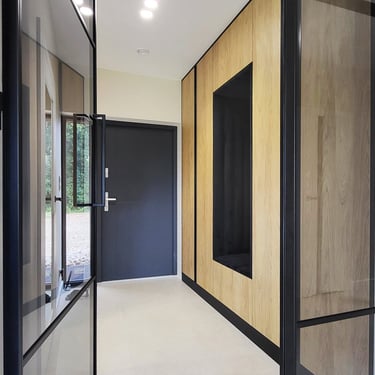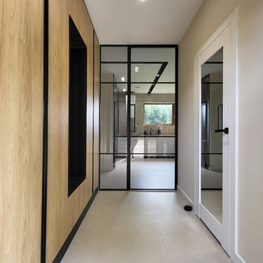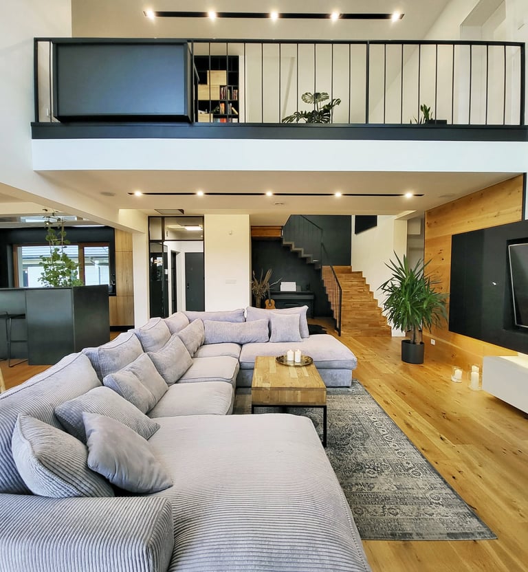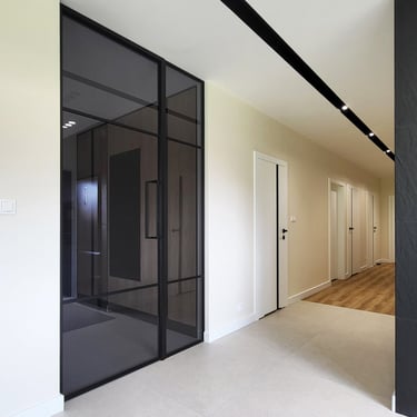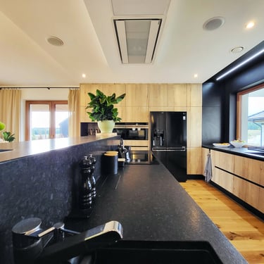 Wnętrze domu zostało zaprojektowane z myślą o harmonii między czystością formy a naturalnym ciepłem materiałów. Czerń, drewno i jasne tony tworzą tu przestrzeń o silnym charakterze, ale pozbawioną surowości – elegancką, wyważoną i przyjemną w codziennym użytkowaniu.