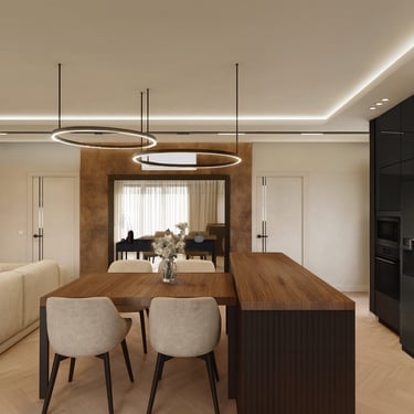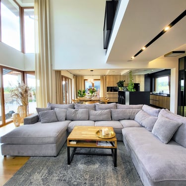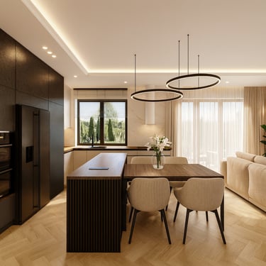 Nowoczesne wnętrze łączy w sobie elegancję, funkcjonalność i ciepło domowego klimatu. Otwarta przestrzeń salonu, jadalni i kuchni została zaprojektowana w duchu minimalistycznego luksusu.