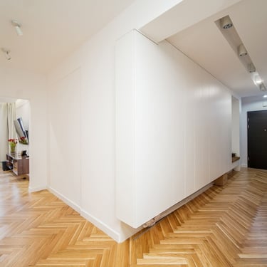 Przestrzeń łączy drewniana podłoga w jodełkę, która ociepla wnętrze i wprowadza klasyczny rytm do nowoczesnej aranżacji.