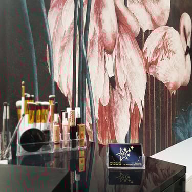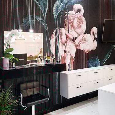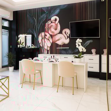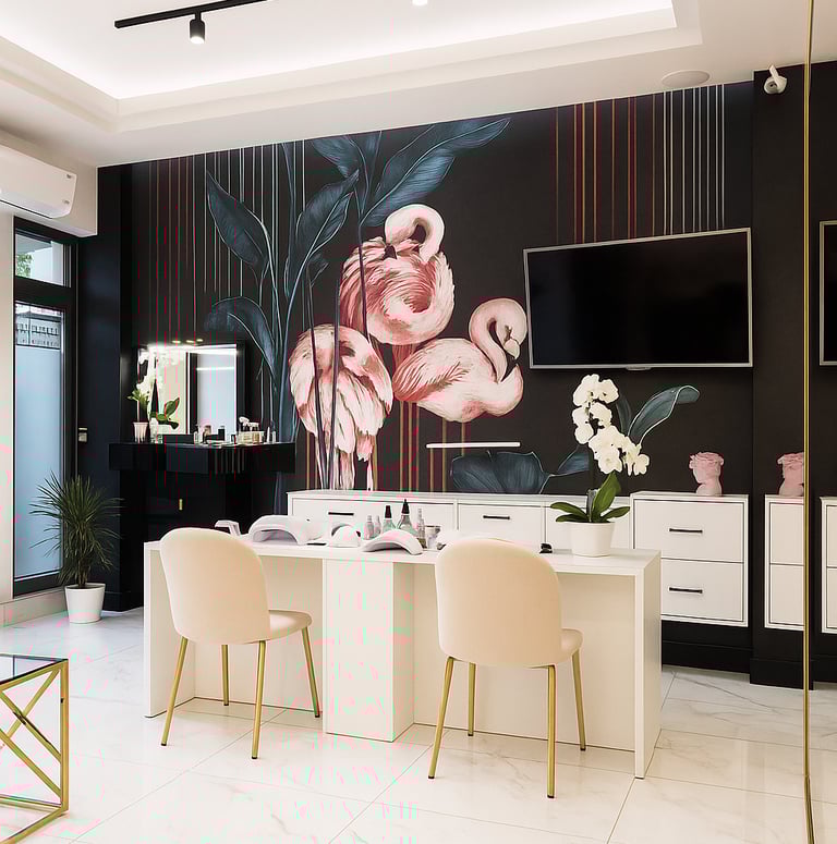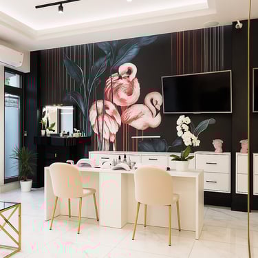 Centralnym elementem aranżacji jest artystyczna tapeta z motywem flamingów, stanowiąca dekoracyjne tło dla całej przestrzeni. Jej wyrazisty wzór przełamuje minimalizm wnętrza, dodając mu wyjątkowości i energii.