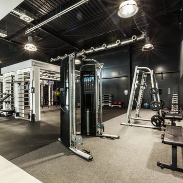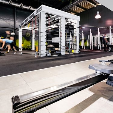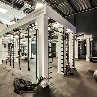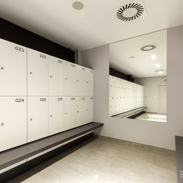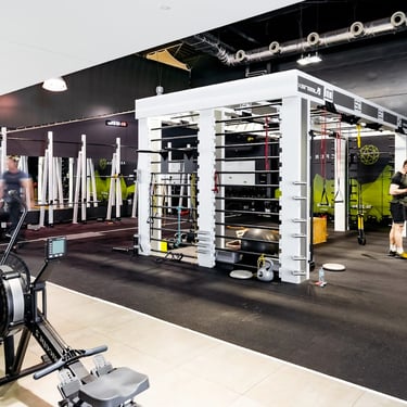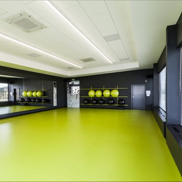W strefach treningowych zastosowano kontrastowe zestawienia kolorów, które motywują do działania: czarne ściany i sufity w strefach siłowych skontrastowano z jasnymi, energetyzującymi zielonymi powierzchniami w salach fitness. Wnętrze zachowuje równowagę między technicznym charakterem a przyjazną atmosferą.