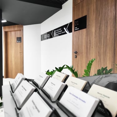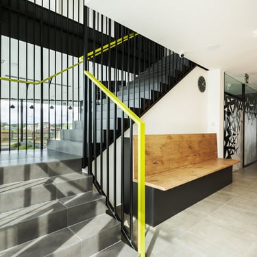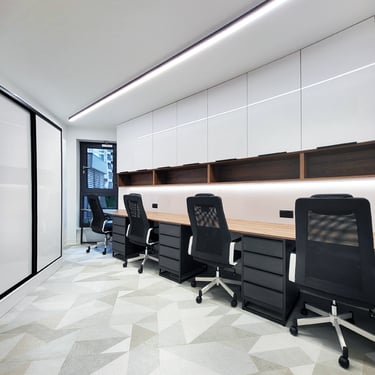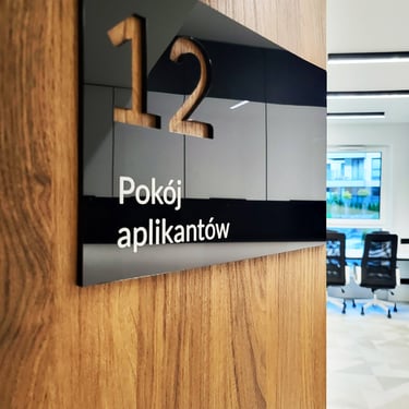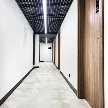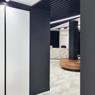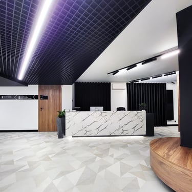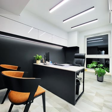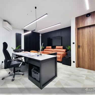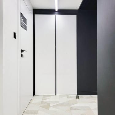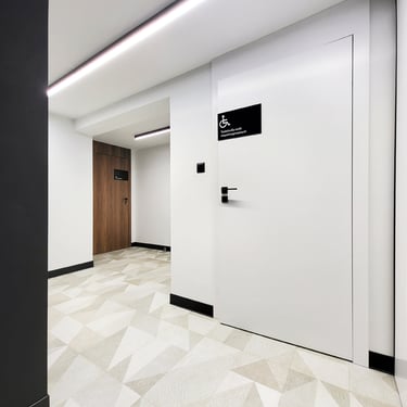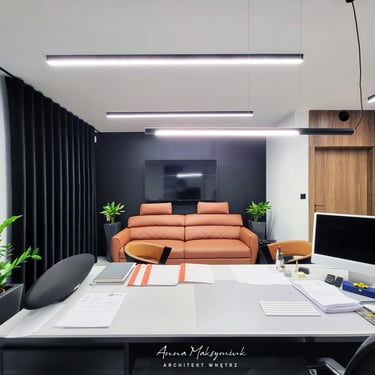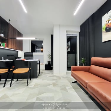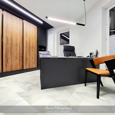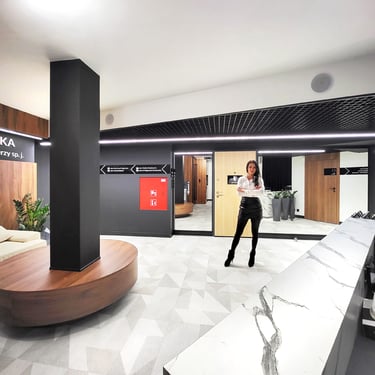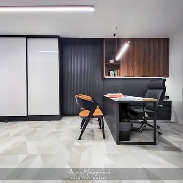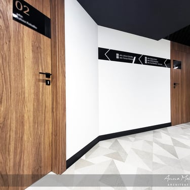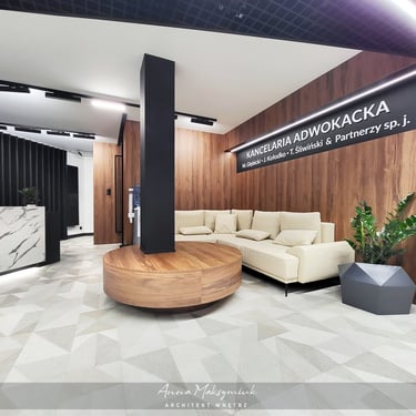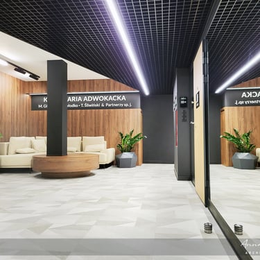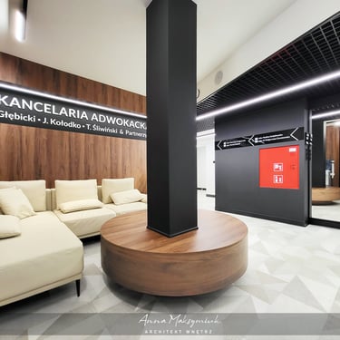 Kwintesencją wspólnych założeń była bezkompromisowa jakość i nowoczesny styl. Chcieliśmy, aby aranżacja kancelarii wyróżniała się nowoczesnymi rozwiązaniami, wykorzystując aktualne trendy w architekturze wnętrz. Graficzne rozwiązania w postaci winylowej podłogi o geometrycznym wzorze czy graficzne oznaczenia, stały się wyróżniającym punktem identyfikacji wizualnej marki.