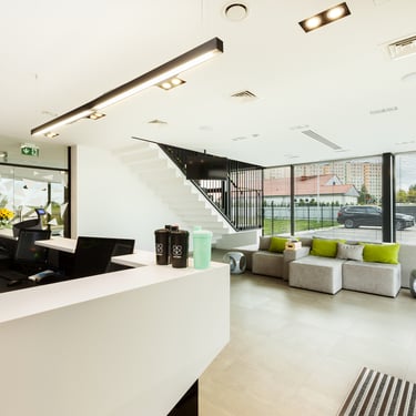 Wnętrze to kontynuacja założeń wizualnych marki – czyste linie, geometryczne formy i kontrasty czerni, bieli oraz zieleni. Recepcja z charakterystycznym, geometrycznym ladą w odcieniach bieli i grafitu wita gości nowoczesnym minimalizmem.